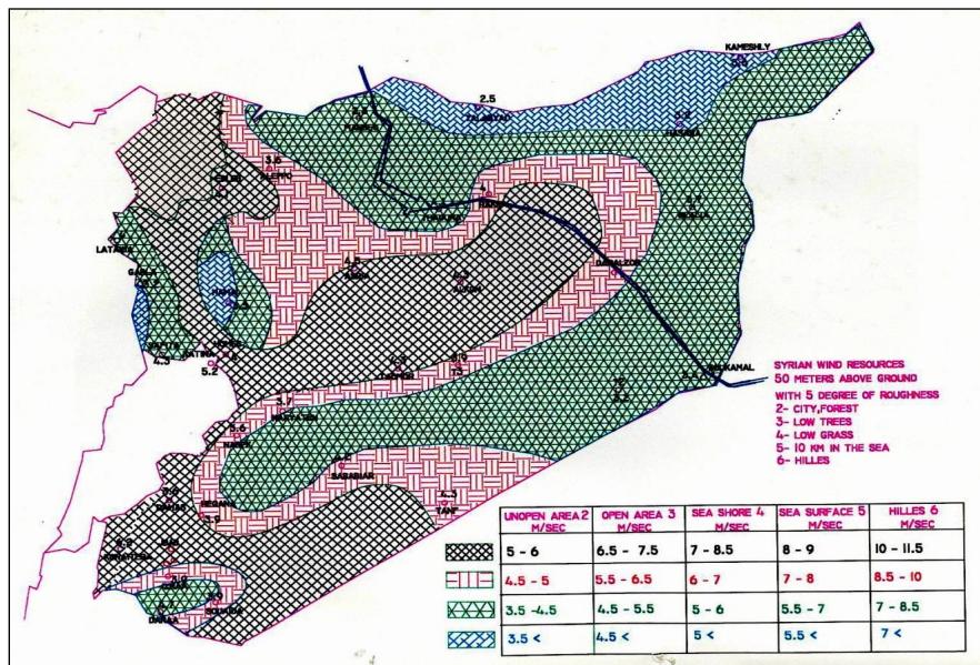 Figure 1: Syria was among the first countries in the region to conduct national wind atlas measurements, which were carried out in 1989. The atlas shows wind zones at a height of 50 meters above ground level, classified by roughness level and wind speed.