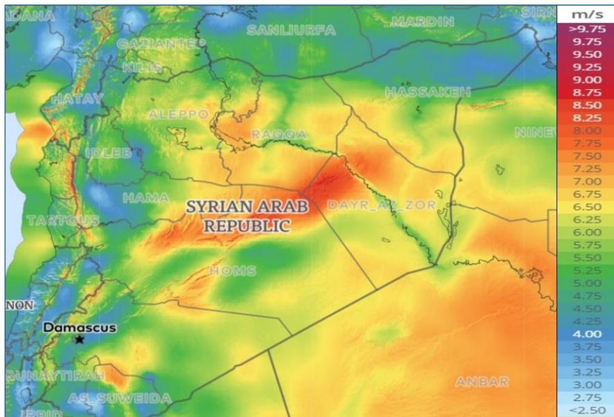 Figure 2: Available wind potential in Syria at a height of 50 meters, according to the Global Wind Atlas.